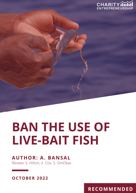 A publication by Charity Entrepreneurship entitled Ban the Use of Live-Bait Fish consists of an analysis of the use of bait fish in the U.S. and concludes with recommendations to ban the use of live-bait fish. The guide provides a step-by-step action plan to conduct what the charity terms as an “intervention.” The authors wrote, “…our best guess is that north-eastern and eastern [U.S.] states with a moderately sized industry are likely to be the most promising states to work in, including but not limited to: Minnesota, Ohio, Wisconsin, and Florida.”