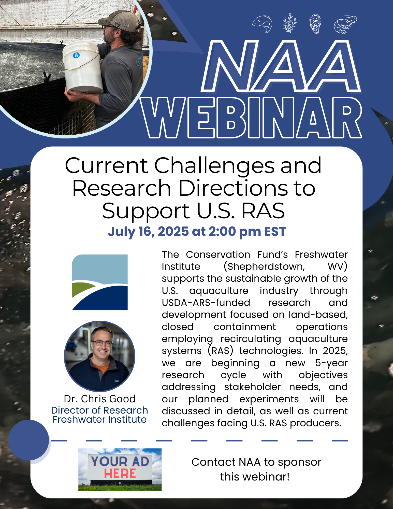 The Conservation Fund’s Freshwater Institute (Shepherdstown, WV) supports the sustainable growth of the U.S. aquaculture industry through USDA-ARS-funded research and development focused on land-based, closed containment operations employing recirculating aquaculture systems (RAS) technologies. In 2025, we are beginning a new 5-year research cycle with objectives addressing stakeholder needs, and our planned experiments will be discussed in detail, as well as current challenges facing U.S. RAS producers.