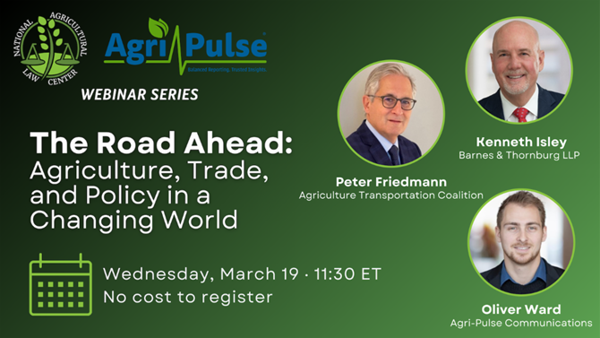 Market access, transportation logistics, and pricing are all impacted by agricultural trade and policy developments, and the March 19 webinar from the National Agricultural Law Center and Agri-Pulse will highlight the latest in international policy and what lies ahead.